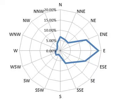 风向:指风的方向,通常用16个方位来表示风向。按照月或者年统计风向变化的平均值,可以绘制出风向玫瑰图。